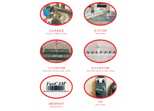 用戶選配 1、翻轉臺面 2、油冷機阿 3、風冷機 4、軟化水系統 5、精密砂量控制漏砂器 6、無線遙控 7、自動變量油泵 8、雙刀頭切割 9、多刀頭純水切割 10、自動清砂系統 11、手輪